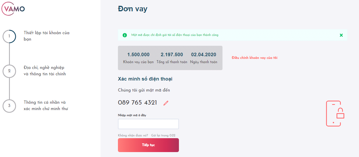 Lúc này bạn hãy xấc thực mã điện thoại địa chỉ để xác minh rồi bấn nào nút tiếp tục vay là link web được.